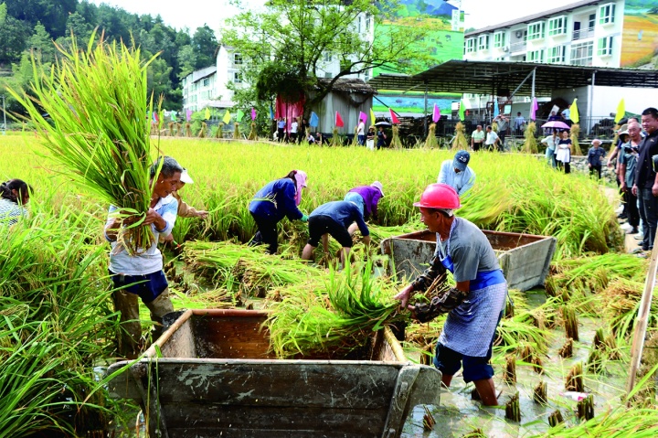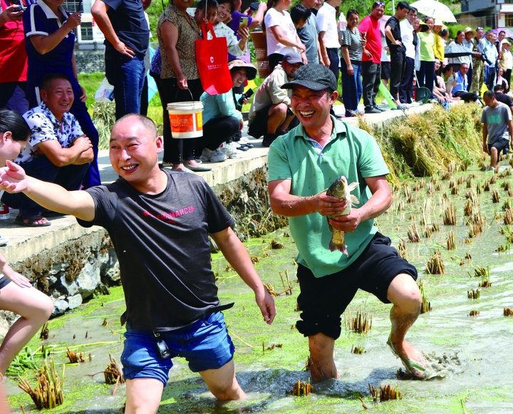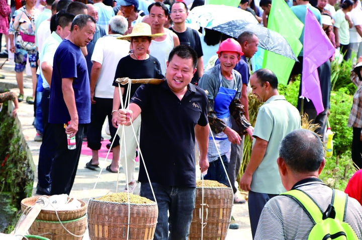 最熱鬧的當屬農民趣味運動會了。在示范片田賽區和廣場,傳統打谷接力賽、挑谷競速賽、稻田拔河等項目依次進行。參賽選手熱情高漲,觀眾們也不斷加油助威,現場笑聲、歡呼聲此起彼伏。稻田摸魚趣這一互動體驗項目,更是讓大人和孩子都樂在其中,充分感受到了田園生活的樂趣。