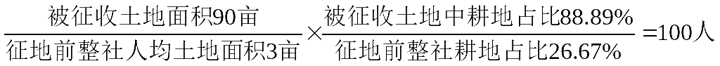 (2)當被征收土地中耕地占比超過農村集體經濟組織耕地占比時,人員安置對象的人數按照被征收土地面積除以被征地農村集體經濟組織人均土地面積計算后,乘以被征收土地中耕地占比再除以農村集體經濟組織耕地占比。以乙社為例,因林地、未利用地占比較大等原因,征地前該社土地總面積為300畝(耕地為80畝),耕地占比為26.67%,集體經濟組織總人口為100人,人均土地為3畝;假設本次征收土地總面積為90畝(耕地為80畝),征收土地中耕地占比為88.89%。因被征收土地中耕地占比(88.89%)大于征地前整社耕地占比(26.67%),則該社本次征地人員安置對象的人數為100人(即)。