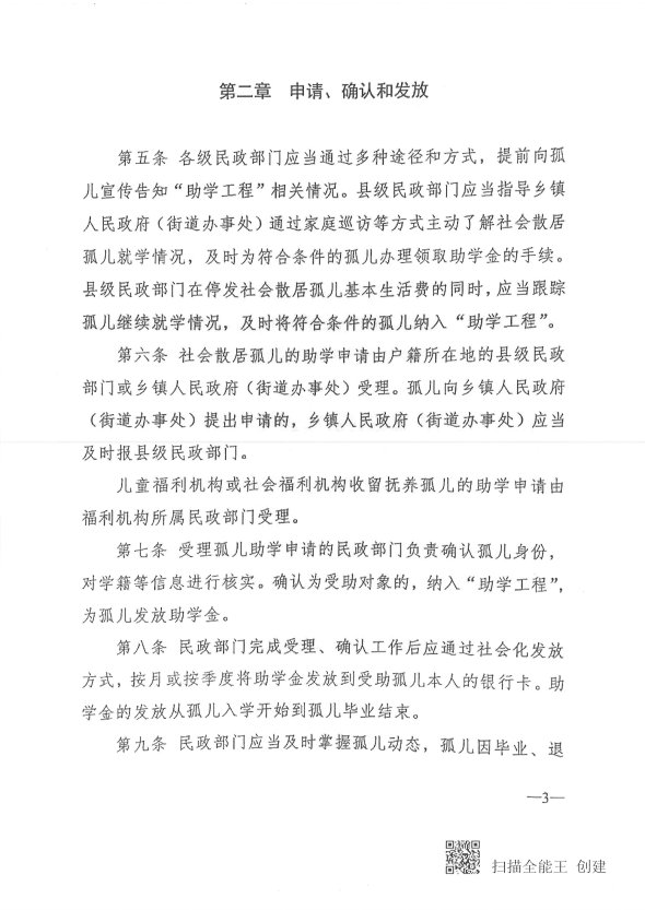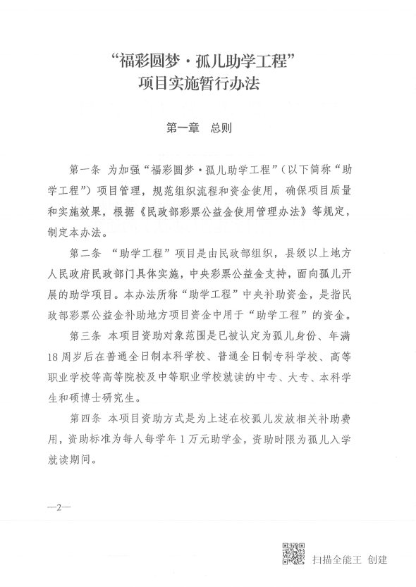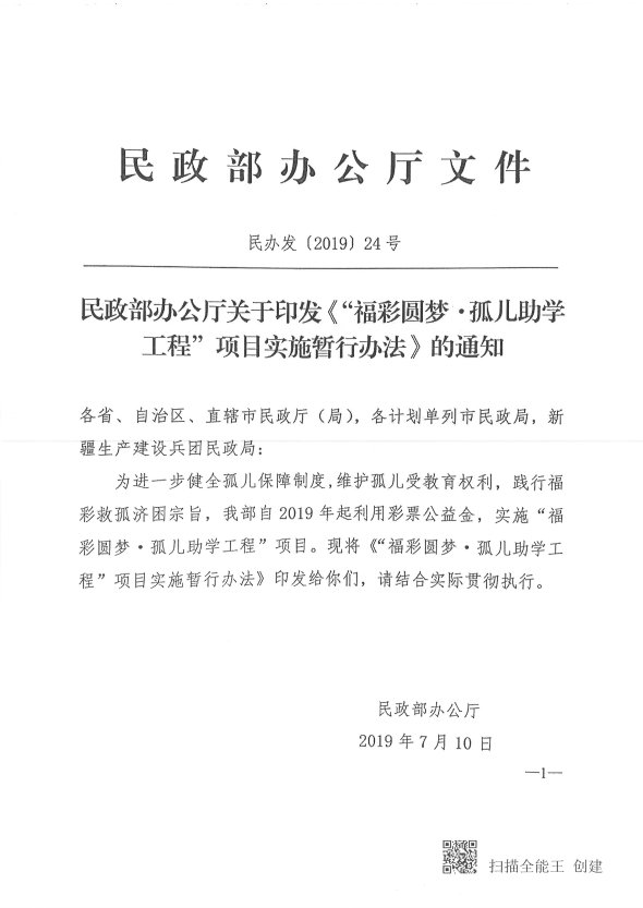 從2019年7月10日起,民政部實施的“福彩圓夢·孤兒助學工程”項目,是進一步健全孤兒保障制度,維護孤兒受教育權利的重要舉措。各區縣(自治縣)要高度重視,認真組織實施。要利用互聯網、媒體等平臺,大力宣傳《“福彩圓夢·孤兒助學工程”項目實施暫行辦法》(以下簡稱《暫行辦法》),做到家喻戶曉。