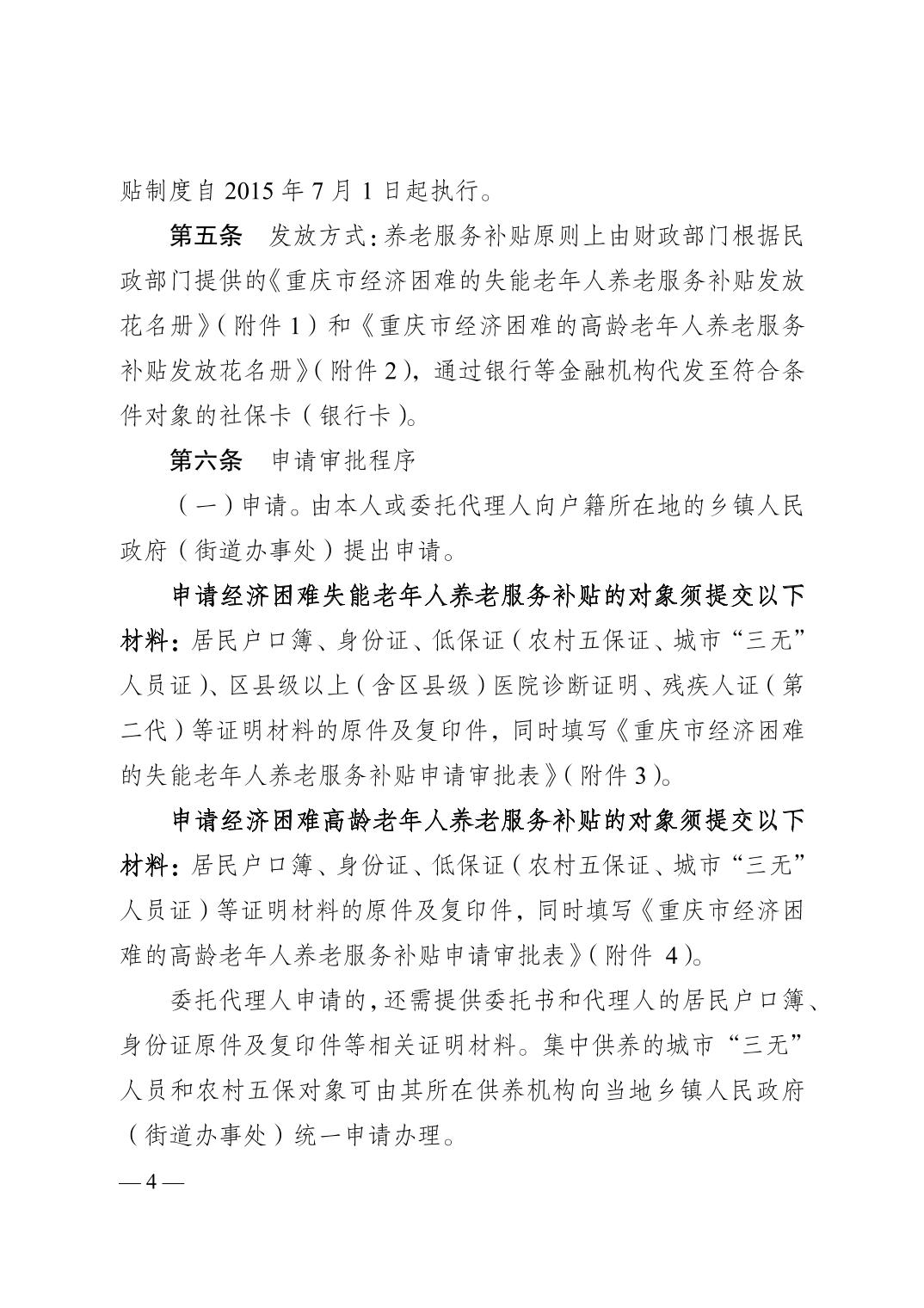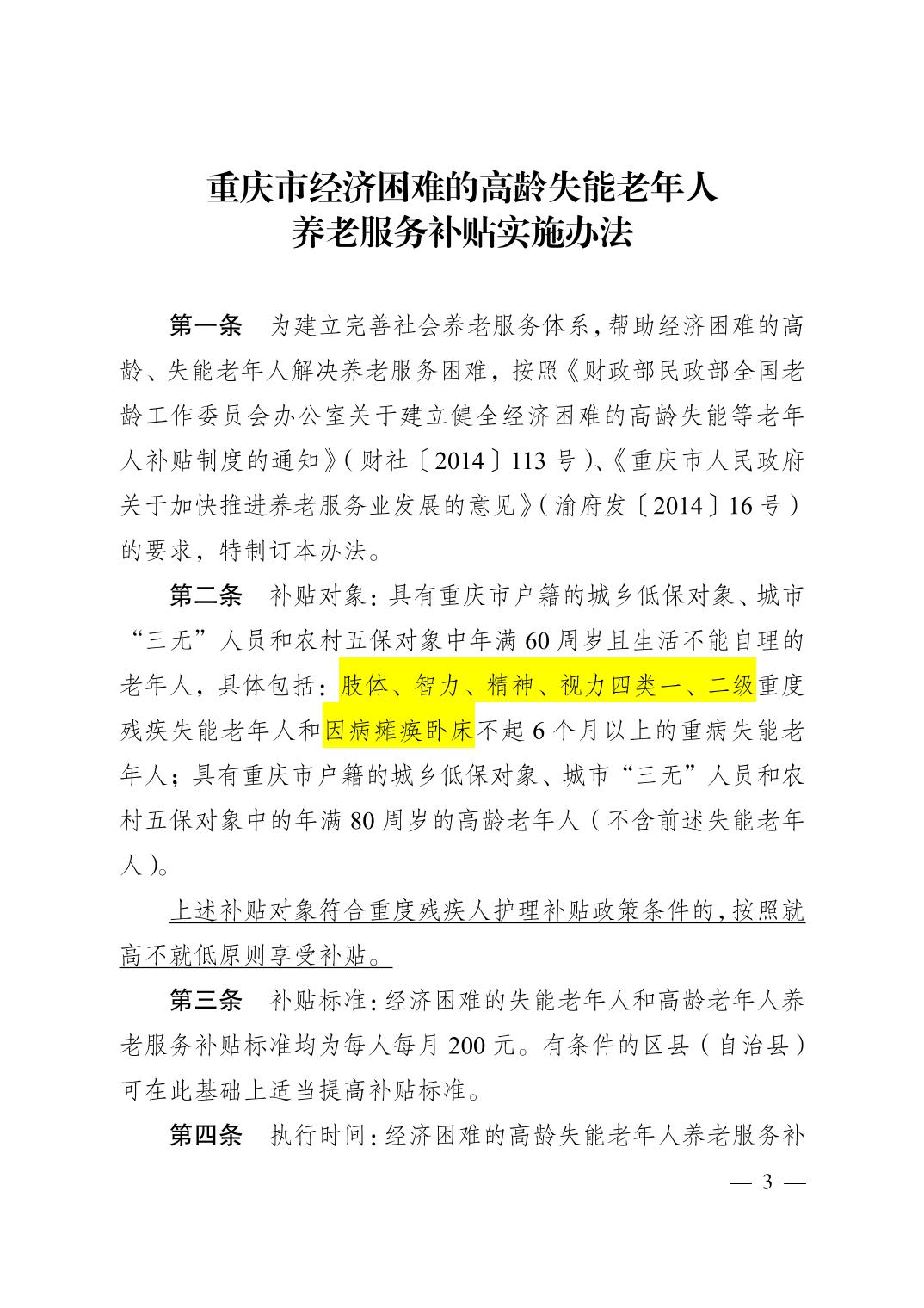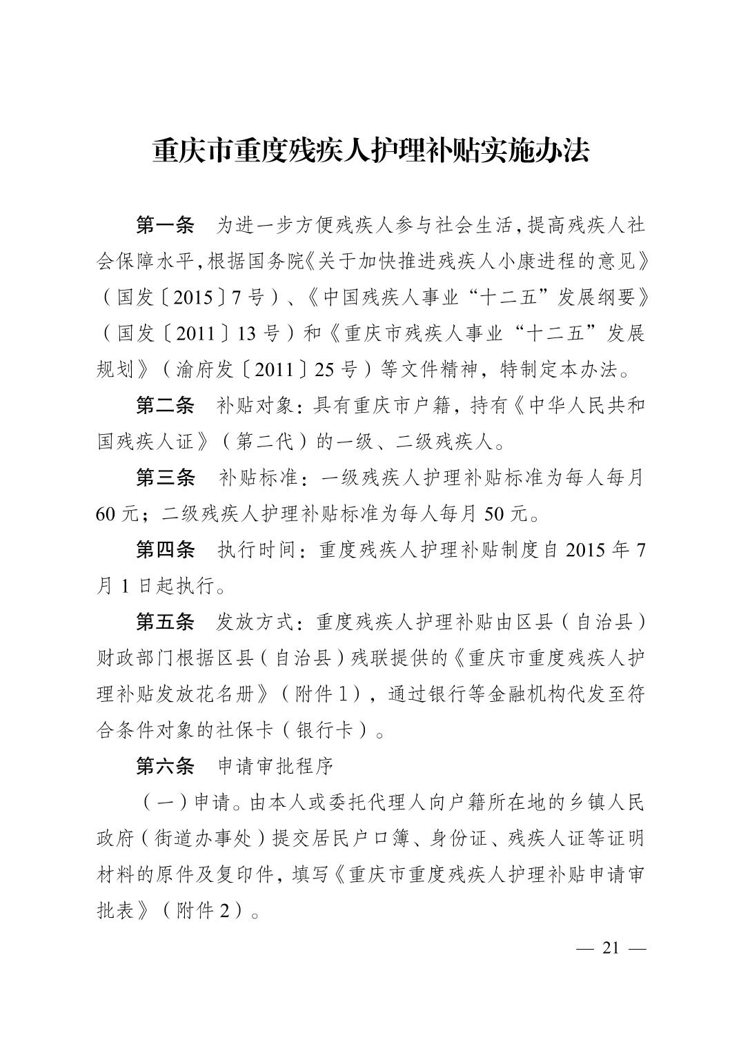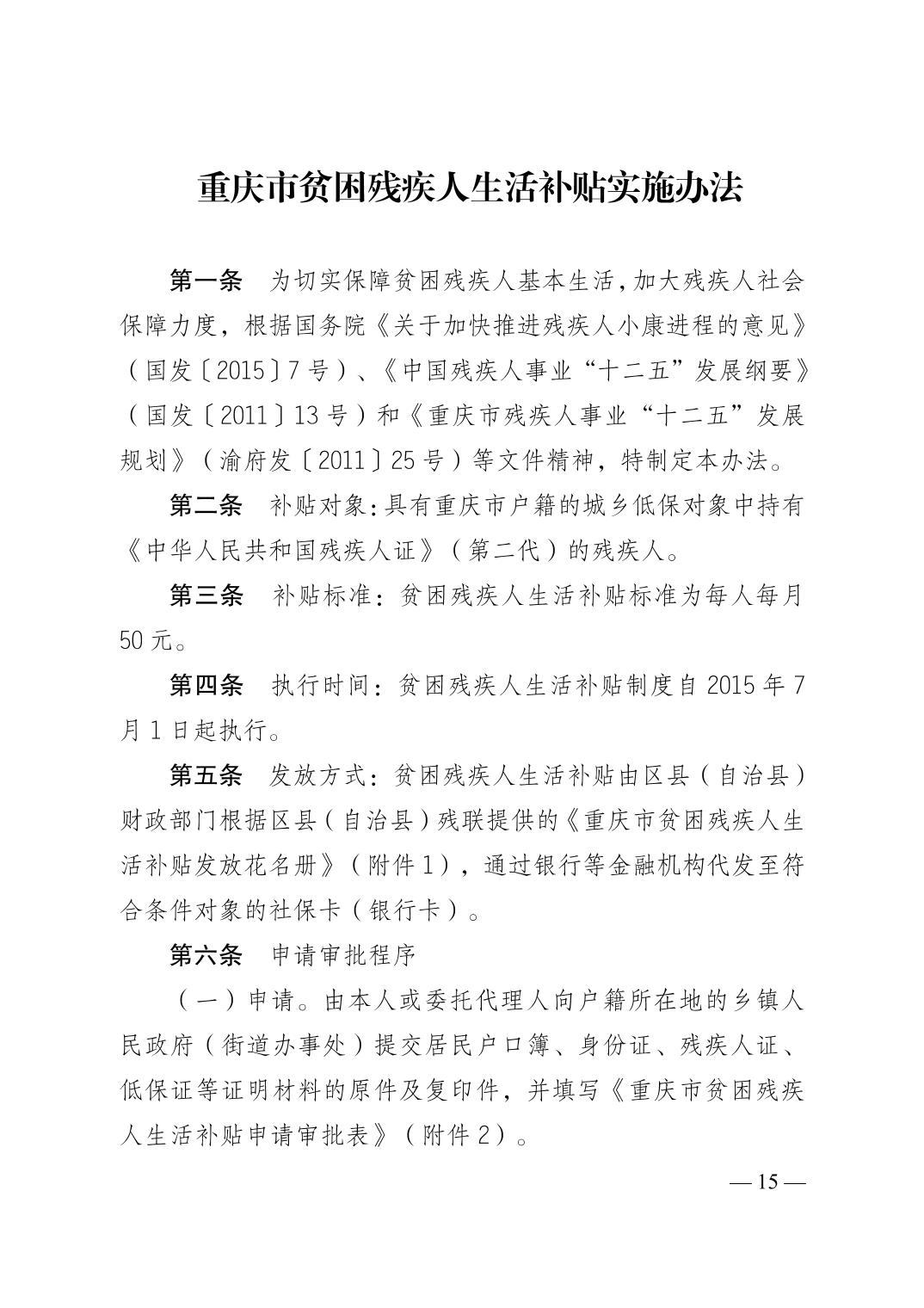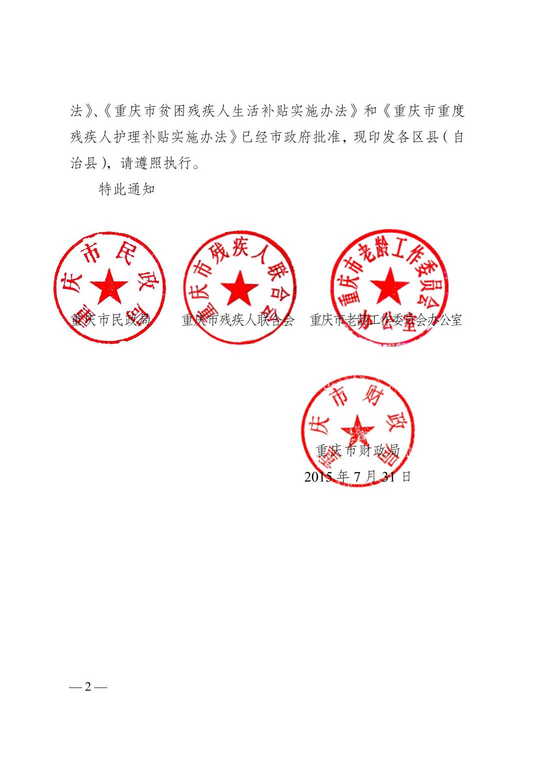 關于印發《重慶市經濟困難的高齡失能老年人養老服務補貼實施辦法》《重慶市貧困殘疾人生活補貼實施辦法》《重慶市重度殘疾人護理補貼實施辦法》的通知(渝民發〔2015〕71號)