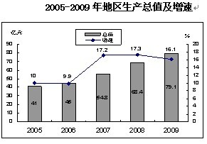 國民經濟持續較快增長。初步核算,2008年全區實現地區生產總值60.48億元,比上年增長17.3%,其中第一產業實現增加值8.78億元,增長7.4%;第二產業增加值29.28億元,增長21.7%;第三產業增加值22.42億元,增長15.3%。三次產業比例由上年的16.1∶45.6∶38.3調整為14.5∶48.4∶37.1,三次產業對經濟增長的貢獻率分別為5.7%、59.9%和34.4%。按常住人口計算的人均GDP為13873元。
