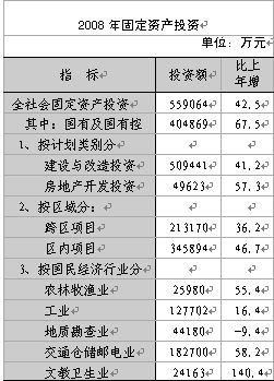 全區全社會固定資產投資完成55.91億元,比上年增長42.5%,其中建設與改造投資完成50.95億元,增長41.2%;房地產開發投資完成4.96億元,增長57.3%。國民經濟各行業中,農林牧漁業投資2.6億元,增長55.4%;工業投資12.77億元,增長16.4%;交通運輸郵電業投資18.27億元,增長58.2%。