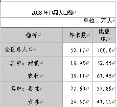 全年城市居民人均可支配收入11132元,比上年增加1352元,增長13.8%。城市居民人均消費支出8478元,增長12.3%。城市居民家庭恩格爾系數(即居民家庭食品消費支出占家庭消費總支出的比重)為33.8%。全年農村居民人均純收入3332元,比上年增加504元,增長17.8%,其中人均工資性收入1108元,增長13.6%;人均家庭經營純收入1862元,增長18.4%;人均轉移性和財產性收入362元,增長29.3%。農民人均生活消費支出2972元,增長13.2%,其中用于食品、衣著消費分別增長8.8%、23.2%;用于居住、交通通訊消費分別下降12.3%、22%;用于文化教育娛樂、醫療保健消費分別增長8.6%、30.6%。農村居民家庭恩格爾系數為53.2%。 養老保險新增參保人員2165人,參保人數達13670人;失業保險新增參保人員1706人,參保職工達18940人;醫療保險新增參保人員736人,參保職工達25125人;工傷保險新增參保人員1021人,參保人數達12633人;生育保險新增參保人員643人,參保人數達7659人;農民工養老保險新增參保人員1762人;為4167名被征地農轉非人員、202名城鎮超齡人員、492名村(居)三職干部辦理了養老保險參保。 城市居民最低生活保障線每人每月由175元調整為230元,人均補助標準由每人每月72.49元調整為128元;農村居民最低生活保障線由每人每年700元調整為1400元,農村低保人均補助標準由每人每年301.44元調整為672元。全區享受城市居民最低生活保障對象待遇12612戶,25447人,全年累計發放城市居民最低生活保障金2603萬元(其中臨時性生活補貼314萬元); 享受農村居民最低生活保障對象待遇7602戶,18127人,全年累計發放農村居民最低生活保障金1218萬元(其中臨時性生活補貼109萬元)。全年支出救助金364萬元對全區9247人實施醫療救助。