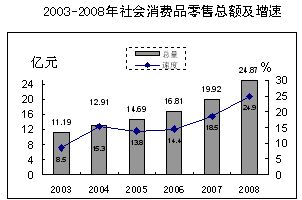 全年社會消費品零售總額實現24.87億元,比上年增長24.9%。分城鄉看,城區實現消費品零售額16.49億元,增長27.9%;農村實現消費品零售額8.38億元,增長19.3%。分行業看,批發零售貿易業零售額22.27億元,增長25.6%;餐飲業零售額2.6億元,增長19%。 在限額以上批發零售業零售額中,食品、飲料、煙酒類比上年增長25.7%;服裝鞋帽、針、紡織品類增長26.8%;家用電器和音像器材類增長24.6%;中西藥品類增長18%;家 具類增長19.7%;通訊器材類增長21.9%,石油及制品類增長25.6%;建筑及裝潢材料類增長19.2%;汽車類增長30.5%。 全年居民消費價格總指數為104.4%,比上年上漲4.4%。