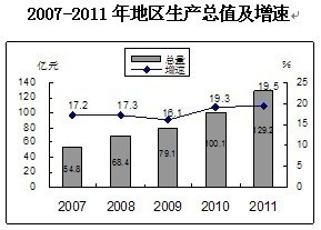 初步核算,2011年全區實現地區生產總值129.19億元,比上年增長19.5%,其中第一產業實現增加值13.78億元,增長5.5%;第二產業增加值71.55億元,增長24.6%;第三產業增加值43.87億元,增長16.3%。三次產業比例由上年的10.6∶53.5∶35.9調整為10.6∶55.4∶34,三次產業對經濟增長的貢獻率分別為3.1%、66.5%和30.4%。