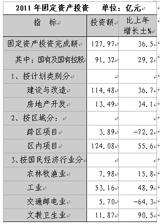 2011年,全區固定資產投資完成127.97億元,比上年增長36.5%,投資對經濟增長的貢獻率為59%,拉動經濟增長11.5個百分點,其中國有投資實現91.32億元,占投資總量的71.4%,成為投資增長的主導力量。全年建設與改造投資完成114.48億元,增長36.7%,占投資總量的89.5%;房地產開發投資完成13.49億元,增長34.1%。國民經濟各行業中,農林牧漁業完成投資7.98億元,增長15.8%;工業完成投資53.16億元,增長48.9%;教育衛生文化事業完成投資11.86億元,增長90.5%。