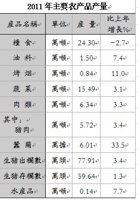 2011年實現農林牧漁業總產值21.6億元,比上年增長4.4%,其中種植業9.05億元,增長2.8%;林業1.23億元,增長4.6%;牧業10.98億元,增長5.9%;漁業0.18億元,增長4.9%。