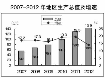 初步核算,2012年全區實現地區生產總值147.95億元,比上年增長13.9%,其中第一產業實現增加值15.52億元,增長5.4%;第二產業增加值83.09億元,增長16.3%;第三產業增加值49.34億元,增長12.1%。