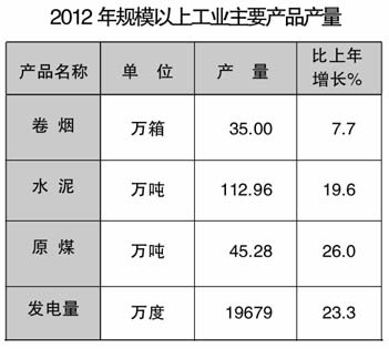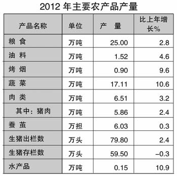 2012年實現農林牧漁業總產值24.2億元,比上年增長5.2%,其中,種植業10.4億元,增長5.6%;林業1.4億元,增長6.9%;牧業11.9億元,增長4.4%;漁業0.2億元,增長18.1%。
