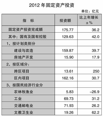 2012年,全區固定資產投資完成175.77億元,比上年增長36.2%,投資對經濟增長的貢獻率為62%,拉動經濟增長8.6個百分點,其中國有投資實現129.63億元,占投資總量的73.7%,是投資增長的主導力量。全年建設與改造投資完成159.87億元,增長39.7%,占投資總量的90.9%;房地產開發投資完成15.90億元,增長17.9%。國民經濟各行業中,農林牧漁業完成投資5.83億元,下降26.9%;工業完成投資69.73億元,增長31.2%;教育衛生文化事業完成投資19.26億元,增長62.2%。