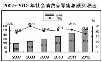 2012年社會消費品零售總額實現51.78億元,比上年增長17.5%。分地區看,城鎮實現消費品零售額39.67億元,增長18.0%;農村實現消費品零售額12.11億元,增長16.0%。分行業看,批發零售貿易業實現零售額46.42億元,增長18.3%;住宿餐飲業實現零售額5.36億元,增長11.3%。消費對經濟增長的貢獻率為38%,拉動經濟增長5.3個百分點。