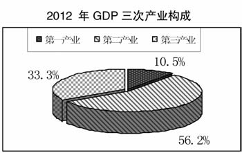 產業結構調整成效明顯。三次產業比例由2011年的10.6∶55.4∶34.0調整為10.5∶56.2∶33.3,三次產業對經濟增長的貢獻率分別為3.6%、66%和30.4%。