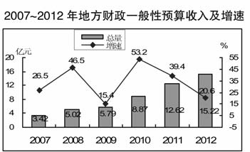 2012年,全區實現財政總收入54.49億元,比上年增長22.4%。實現地方財政收入28.11億元,增長23.0%,一般性預算收入15.22億元,增長20.6%,實現稅收收入10.23億元,其中增值稅和營業稅分別增長17.4%和17.7%。全年地方財政支出54.87億元,比上年增長15.8%,其中農林水事務支出增長25.1%,教育支出增長67.0%,醫療衛生支出增長21.2%,社會保障和就業支出增長4.41%,城鄉社區事務支出增長5.6%。