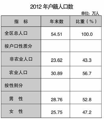 2012年末全區戶籍總人口54.51萬人,比上年增加0.38萬人,其中非農業人口23.62萬人,農業人口30.89萬人,戶籍人口自然增長率為4.26‰。年末全區常住人口44.91萬人,城鎮化率42.53%。