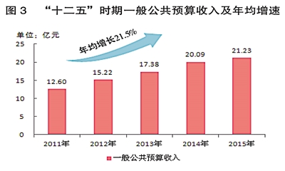 財政收入保持平穩。全年一般公共預算收入21.23億元,比上年增長5.7%。其中,稅收收入14.19億元,下降1.8%。一般公共預算支出54.32億元,增長11%。其中,城鄉社區支出4.99億元,增長12.4%;社會保障和就業支出4.6億元,增長11.9%;教育支出10.52億元,增長12.1%;農林水支出9.17億元,增長24.3%;一般公共服務支出4.42億元,下降15.4%;醫療衛生與計生支出5.29億元,增長19.9%;文體與傳媒支出0.69億元,增長30.5%。
