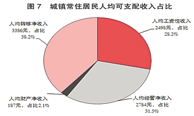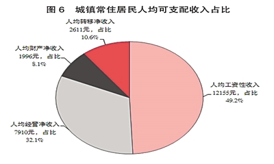 全年城鎮常住居民人均可支配收入24672元,比上年增加2284元,增長10.2%。其中,人均工資性收入12155元,增長8.9%;人均經營凈收入7910元,增長13%;人均財產凈收入1996元,增長15.3%;人均轉移凈收入2611元,增長4.5%。全年城鎮常住居民人均消費支出18202元,比上年增長10%。