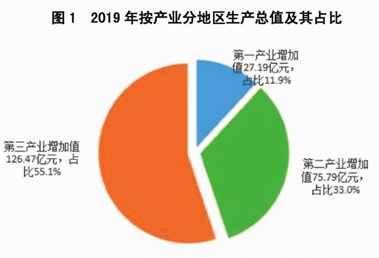 初步核算,全年地區生產總值229.44億元,比上年增長3.0%。按產業分,第一產業增加值27.19億元,增長4.5%;第二產業增加值75.78億元,增長0.6%;第三產業增加值126.47億元,增長4.1%。三次產業結構比為:11.9:33.0:55.1。民營經濟增加值 ?126.67億元,下降1.3%,占全區經濟總量的55.2%。按常住人口計算,全區人均地區生產總值47318元,比上年增長2.1%。
