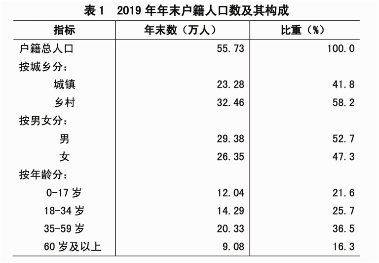 年末戶籍人口55.73萬人。其中,城鎮人口23.28萬人,鄉村人口32.46萬人。全年遷出人口0.42萬人,遷入人口0.30萬人。