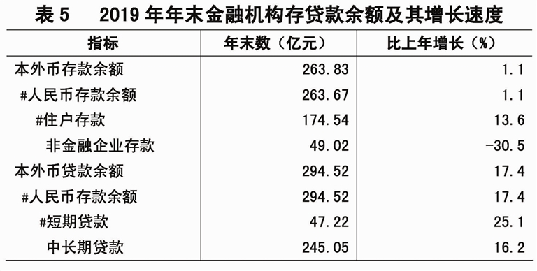 年末全區金融機構本外幣存款余額263.83億元,比上年末增長1.11%。其中,人民幣存款余額263.67億元,增長1.11%。金融機構本外幣貸款余額294.52,比上年末增長17.4%。其中,人民幣貸款余額294.52億元,增長17.4%。