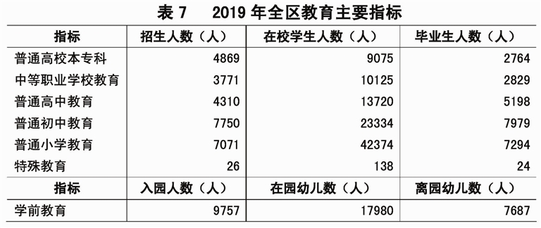 全區共有普通高等教育學校2所,中等職業學校2所,普通中學27所,普通小學71所,幼兒園146所,特殊教育學校1所。高中階段教育毛入學率98.5%,初中入學率100.0%,小學入學率100.0%,學前教育三年毛入園率90.1%。學前教育普惠率95.3%。九年義務教育鞏固率100.0%。
