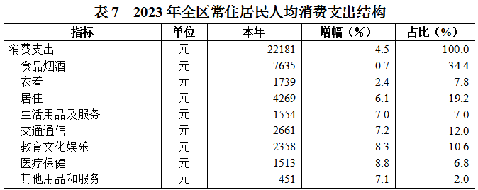 全區常住居民人均可支配收入34131元,比上年增加1668元,增長5.1%。全區常住居民人均消費支出22181元,比上年增加958元,增長4.5%。