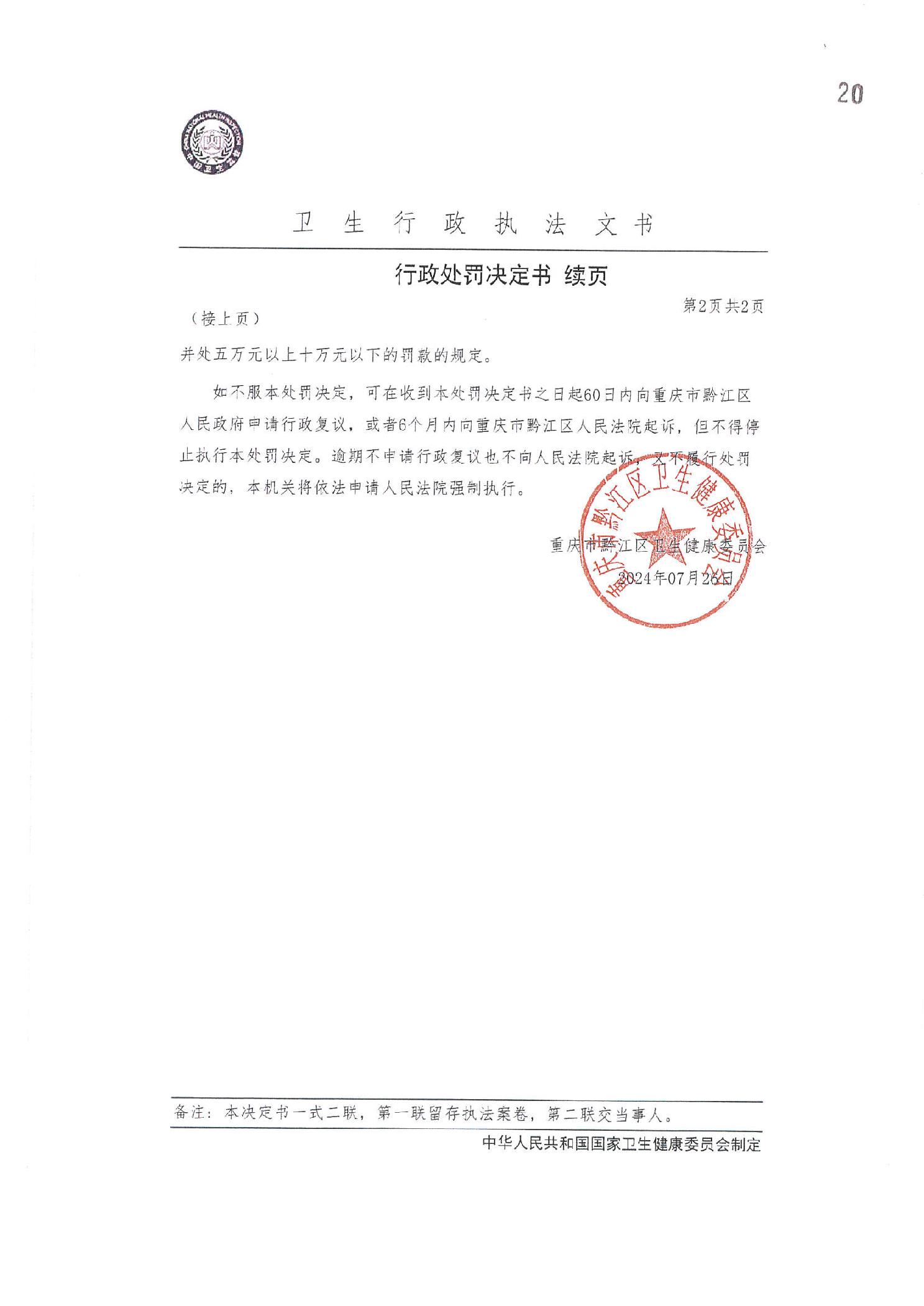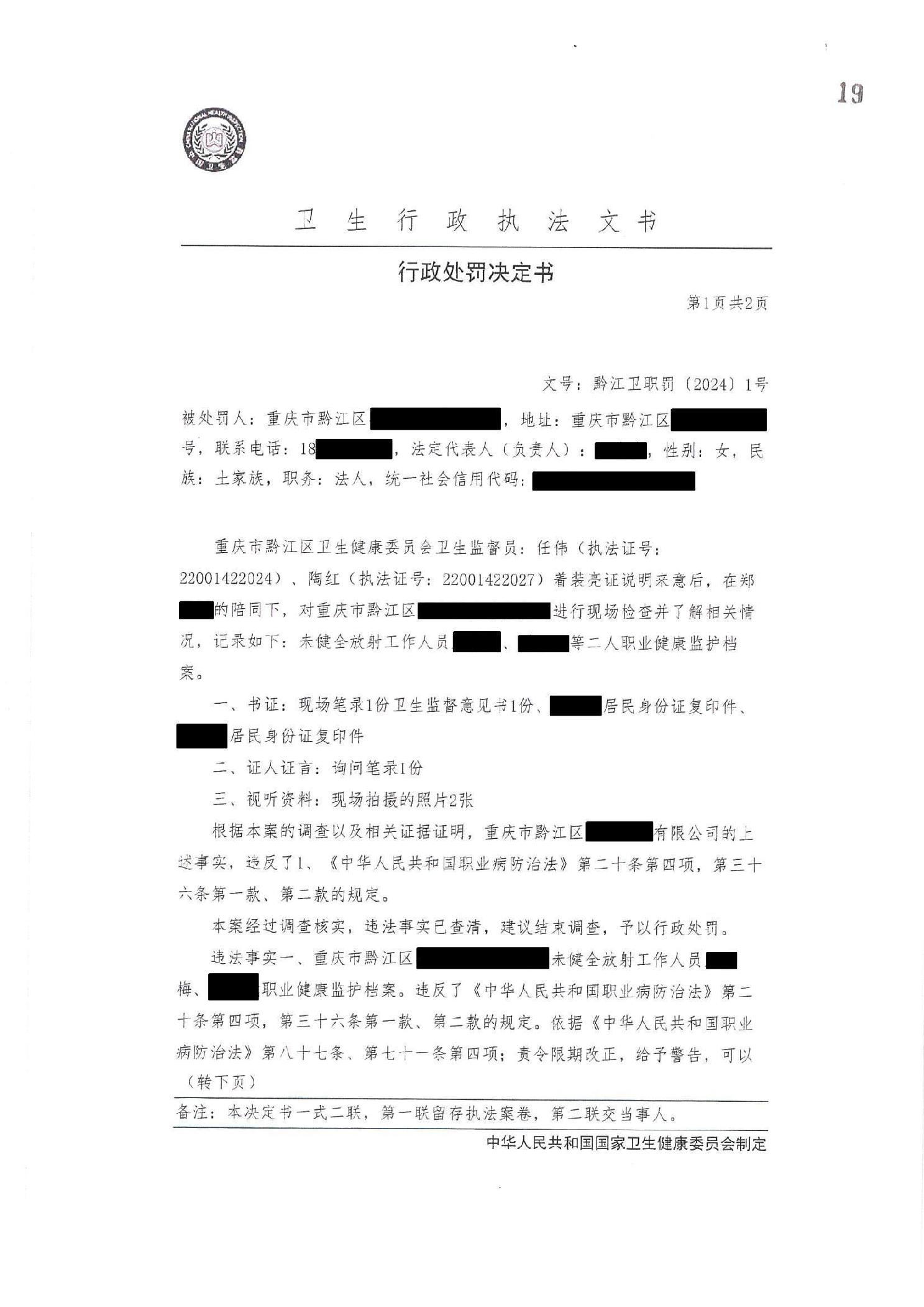 行政處罰決定書(黔江衛職罰〔2024〕1號)
