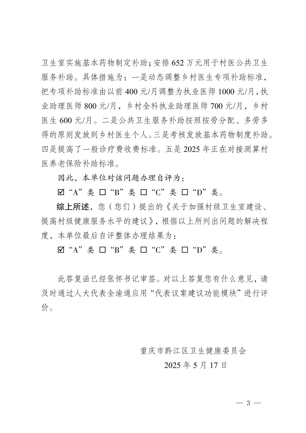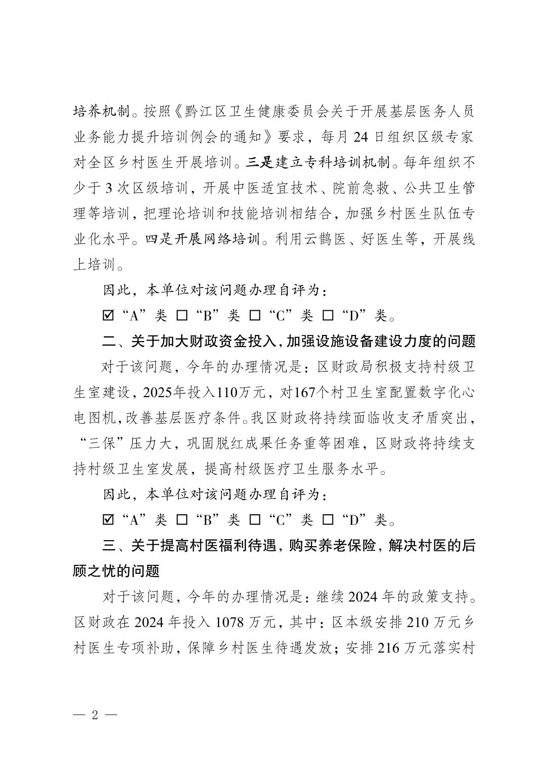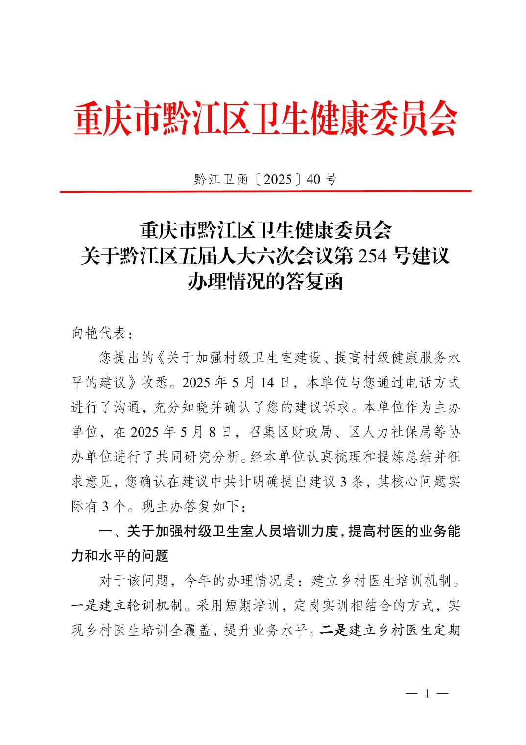 重慶市黔江區衛生健康委員會關于黔江區五屆人大六次會議第254號建議辦理情況的答復函