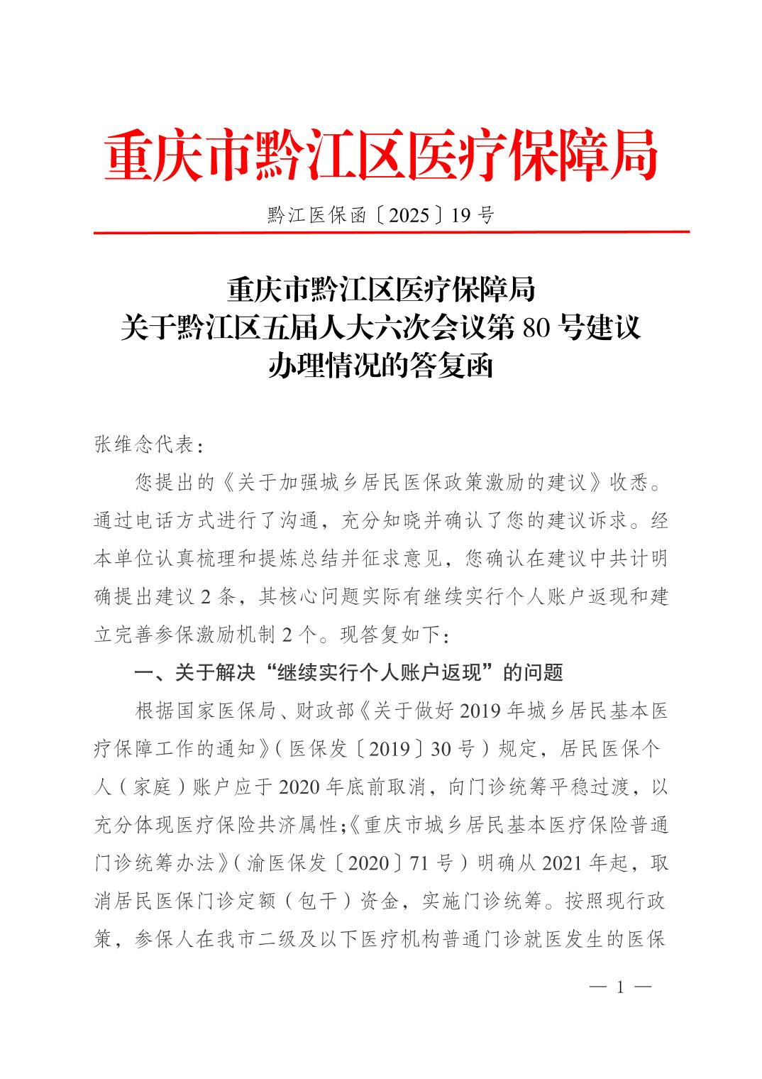重慶市黔江區(qū)醫(yī)療保障局關于黔江區(qū)五屆人大六次會議第80號建議辦理情況的答復函