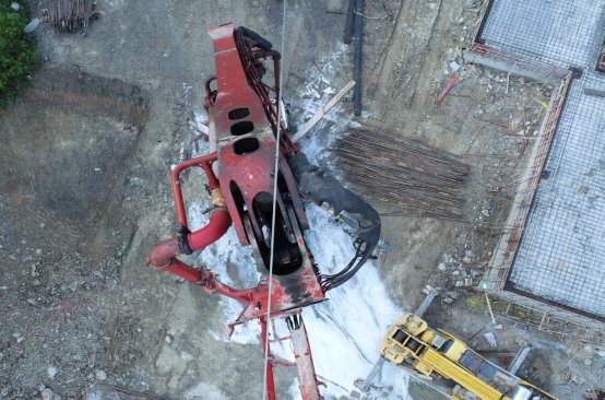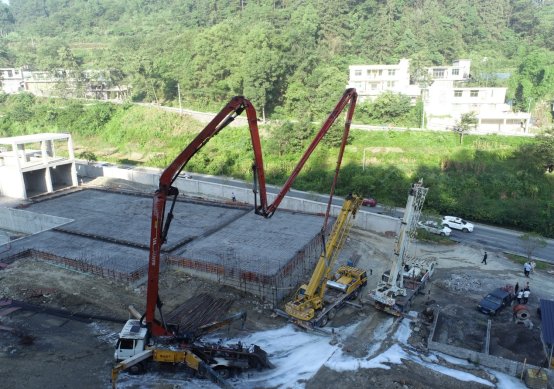 事故現場遠景圖(事故泵車準備給右側建筑澆筑混凝土)