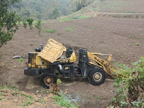 事故地點位于重慶市黔江區馮家街道寨子社區6組高標準農田建設項目機耕道1,該機耕道1路寬4.3米,可行路面寬度3米,事發路段坡度28°,無道路標志標線,干燥的泥巴路面,路面不平整,入口處旁可見“前方施工、禁止通行”字樣的標牌。