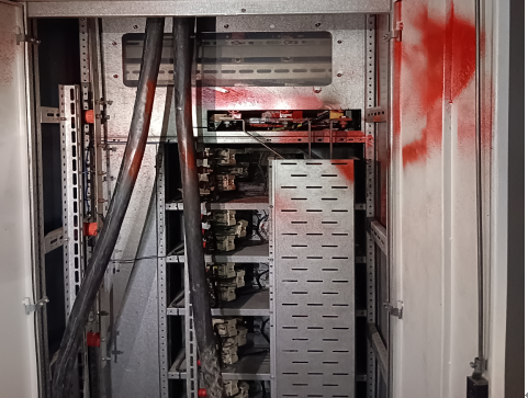 事故現(xiàn)場(chǎng)位于黔江區(qū)正陽(yáng)街道恒大名都2號(hào)地塊地下車庫(kù)1#專用配電室,該配電室已于2025年1月通過(guò)黔江區(qū)供電公司驗(yàn)收,該配電室懸掛了相關(guān)管理制度,明確指出不得攜帶易燃易爆品進(jìn)入配電室。事發(fā)當(dāng)天,該配電室所有控制柜未斷電,未見(jiàn)絕緣手套、絕緣鞋,12ZD5配電控制柜內(nèi)有油漆噴濺痕跡,11ZD2配電控制柜(380V)頂部蓋板被踩塌陷與帶電母排相接觸并伴有電擊痕跡。