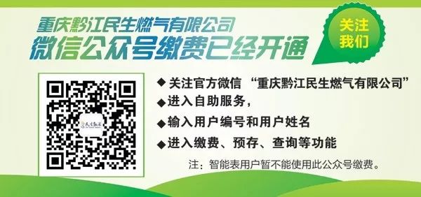 1.?掃描二維碼關注官方微信公眾號“重慶黔江民生燃氣有限公司”。
