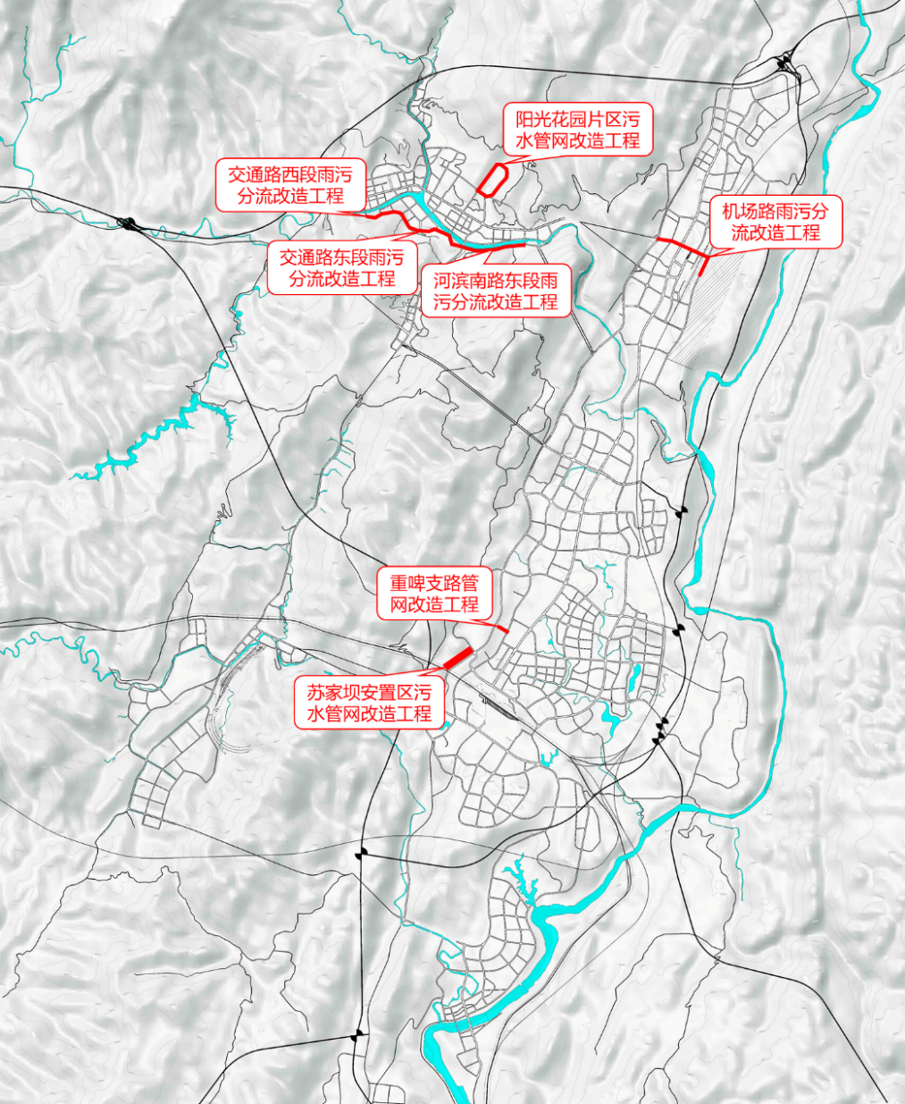 因地制宜開展管網更新修復和改造。因地制宜采取溢流口改造、截流井改造、破損修補、管材更換、增設調蓄設施等工程措施,對現有雨污合流管網開展改造,降低合流制管網溢流污染,重點開展交通路東段、交通路西段、河濱南路東段、機場路、朝陽路、金龍路、城西片區、城北片區雨污分流改造工程。結合老舊小區改造、城市更新實施混錯接、漏接、老舊破損管網更新修復,明確重點開展老舊小區源頭式的雨污水分流改造工程,提升污水收集效能,重點開展重啤支路、雨潤支路、蘇家壩安置區、陽光花園片區管網等改造工程。