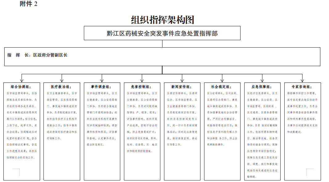 成員:區委宣傳部、區委網信辦、區市場監管局、區衛生健康委、區經濟信息委、區公安局、區司法局、區財政局、區生態環境局、區交通局、區商務委、區應急局、區醫保局、黔江海關、黔江食藥檢所,事發地鄉鎮街道。