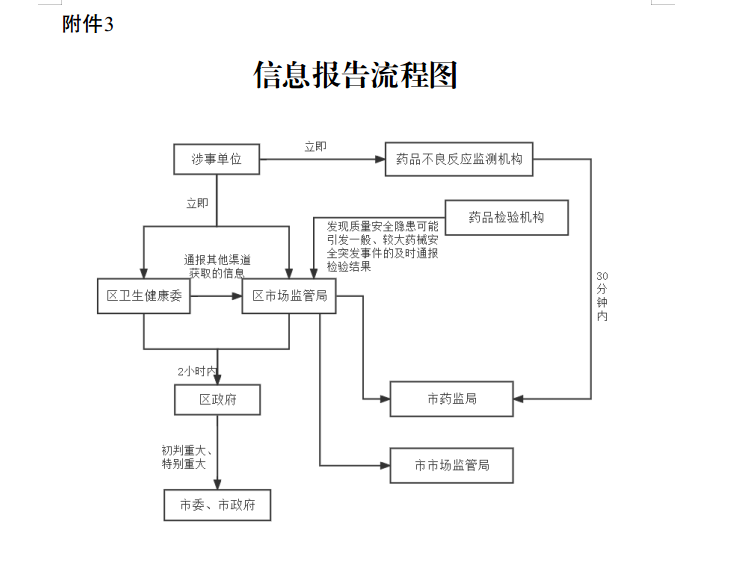(4)發生重大、特別重大藥械安全突發事件,區委、區政府在接報后30分鐘內向市委值班室、市政府總值班室電話報告、1小時內書面報告。