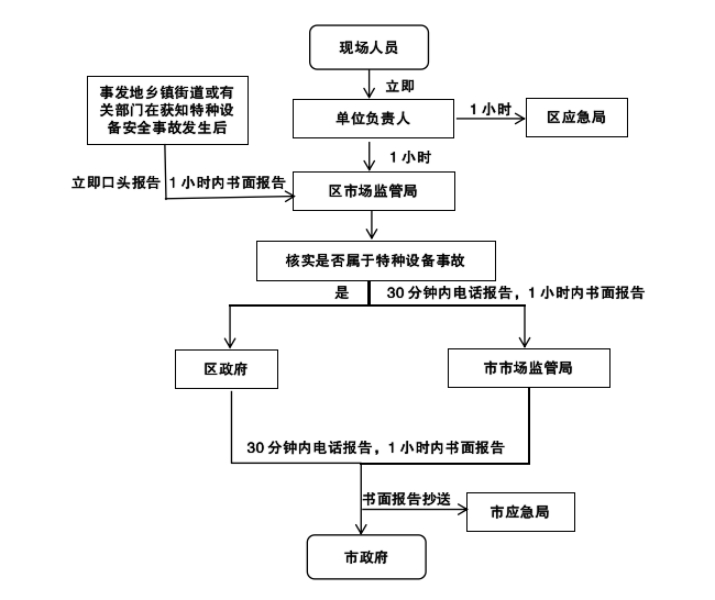 區市場監管局接到有關特種設備事故報告后,應當立即組織查證核實。屬于特種設備事故的,應當在接到報告后30分鐘內電話報告、1小時內書面報告區政府和市市場監管局,區政府要在接到報告后30分鐘內電話、1小時內書面向市政府報告,書面報告同時抄送市應急局。