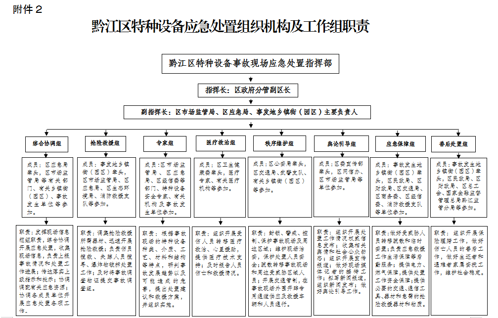 應急指揮機構。發生(或可能發生)較大特種設備事故、發生一般特種設備事故時,成立黔江區特種設備事故現場應急指揮部(以下簡稱區指揮部),由區政府分管副區長擔任指揮長,區市場監管局、區應急局、事故發生地鄉鎮街道(園區)主要負責人任副指揮長,區級有關部門負責人為成員,負責較大或一般特種設備事故應急處置的組織、指揮、協調工作(區指揮部及成員單位職責見附件1);區指揮部下設綜合協調組、搶險救援組、專家組、醫療救治組、秩序維護組、輿論引導組、應急保障組、善后處置組等工作組(工作組職責見附件2)。當發生(或可能發生)特別重大或重大特種設備事故時,按照市指揮部統一指揮處置。