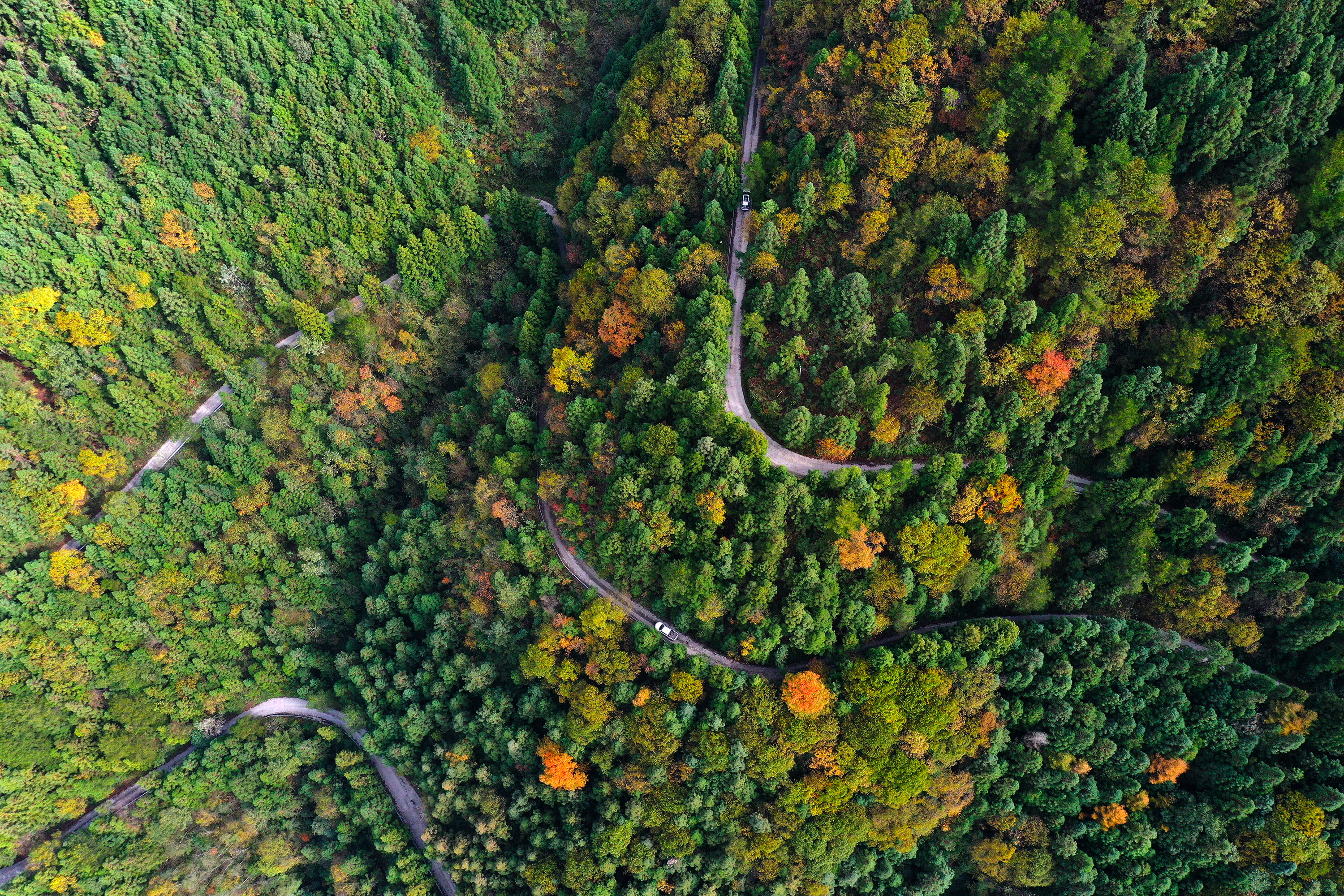 11月12日,黔江國家森林公園,車輛行駛在灰千梁子景區(qū)彩葉林間的公路上(無人機(jī)照片)。特約攝影楊敏