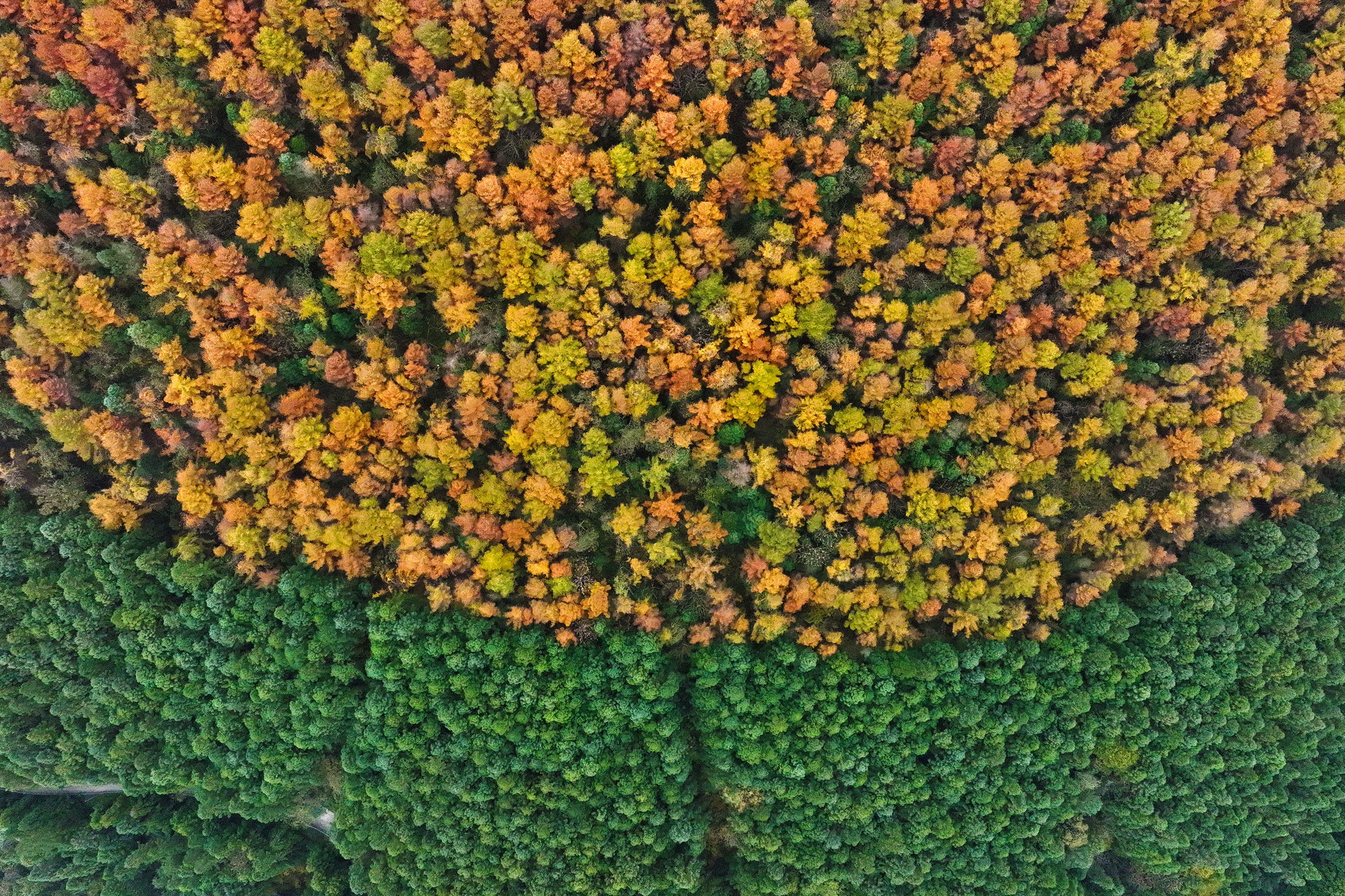 11月12日,黔江國家森林公園灰千梁子景區(qū),落葉松與柳杉相間,呈現(xiàn)出“平分秋色”的景觀(無人機(jī)照片)。特約攝影楊敏